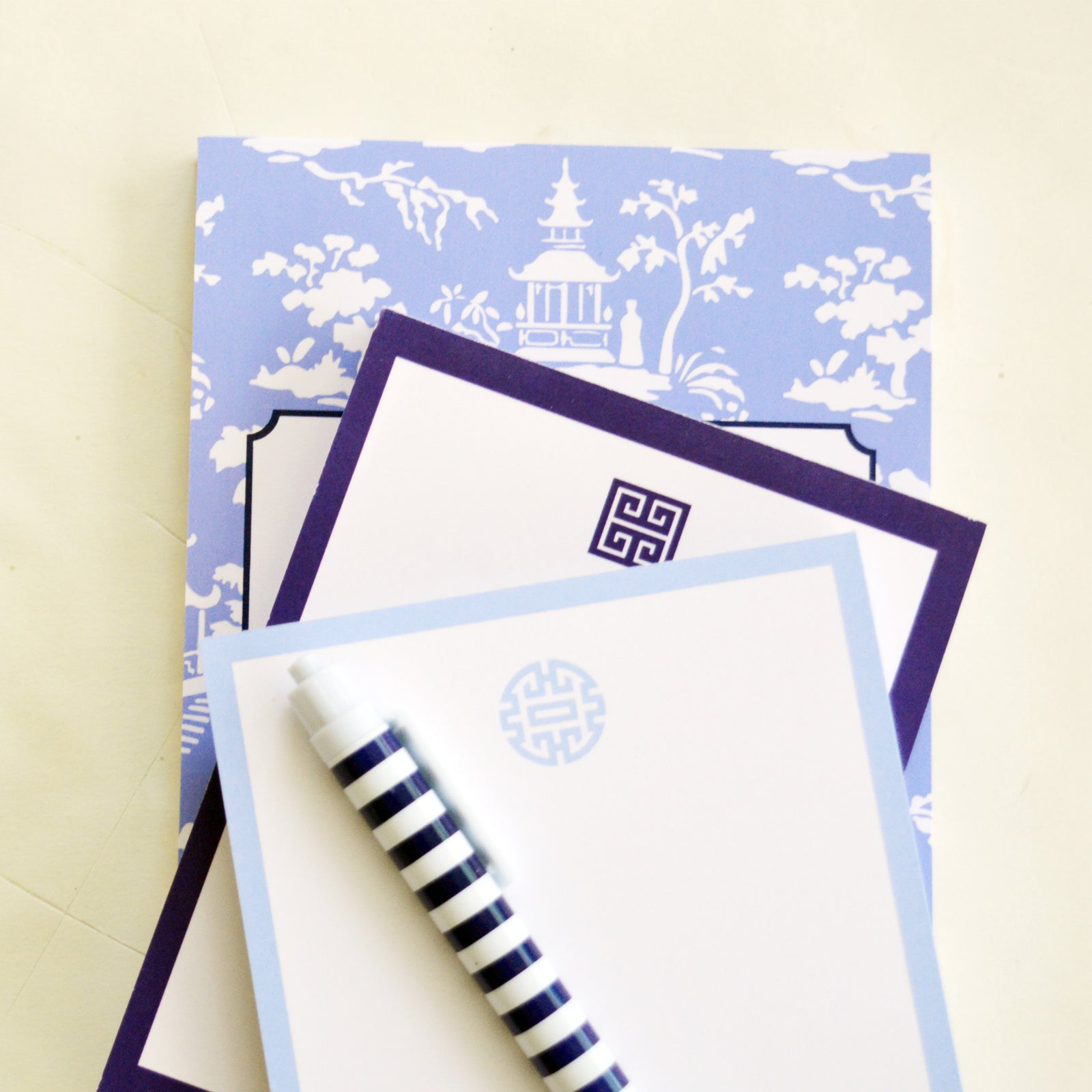 Celebrate the winter blues with our new Chinoiserie Toile pattern, available on notecards, notepads, gift tags, stickers and more. The China blue and white toile features an asian inspired landscape with pagodas.