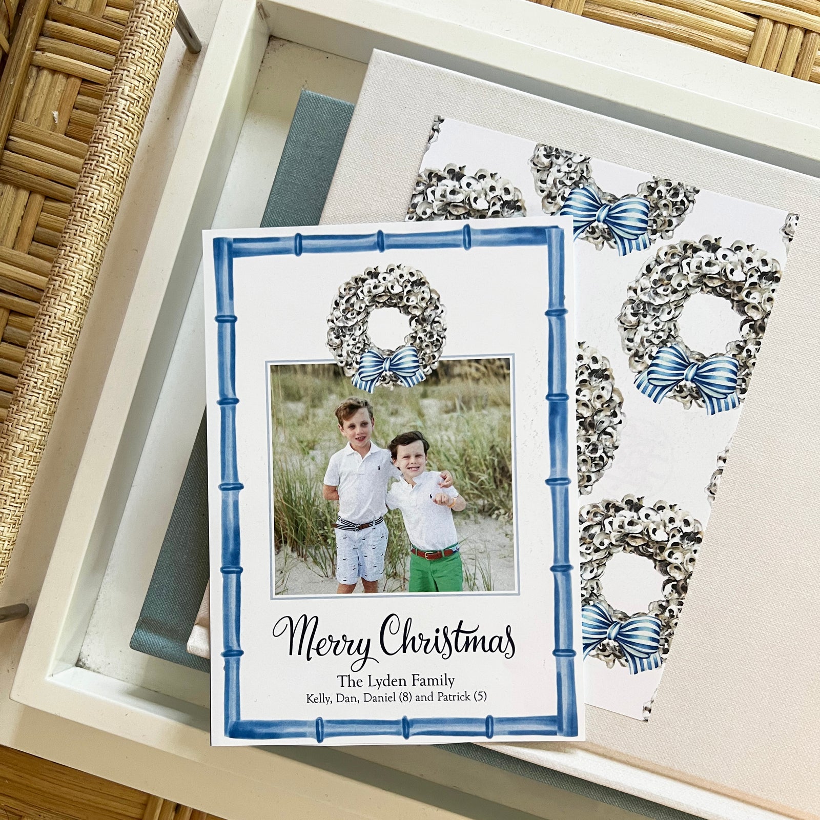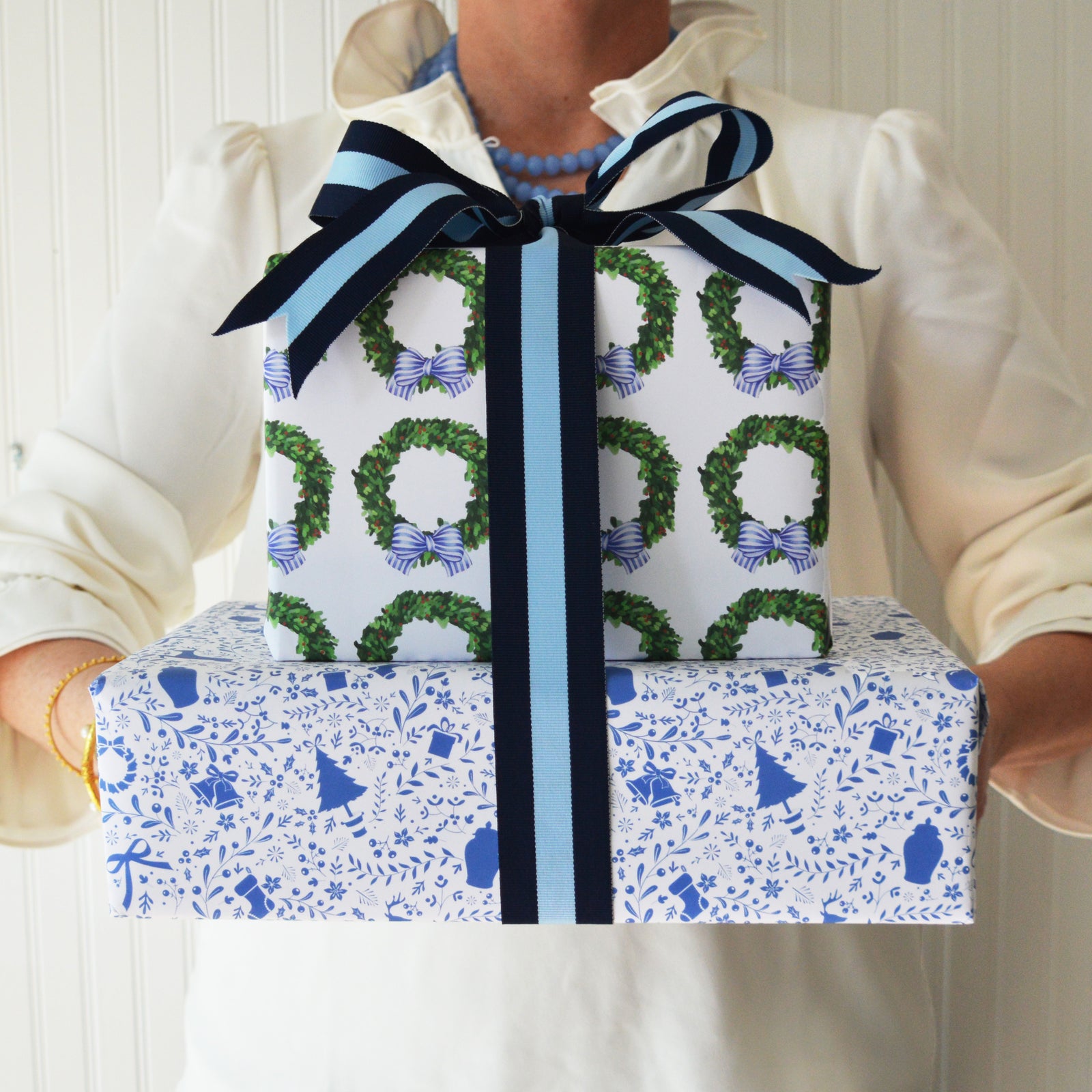 I love incorporating my love of blue and white into the holidays. Christmas doesn't have to ONLY be red and green! This combination of papers and our stripe ribbon is darling, and I think plays into the Coastal Grandmother trend a bit.