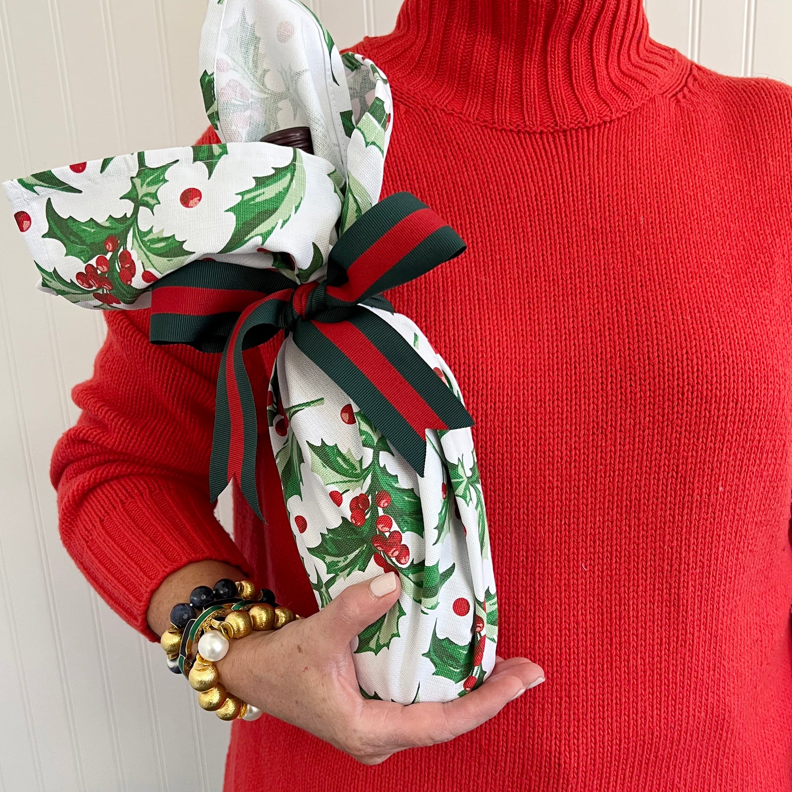 He's wearing a long red coat with nordic details, carrying a Christmas tree and a gift wrapped in our signature ginger jar gift wrap. He's darling on his own, and makes the perfect compliment to our classic Christmas patterns.