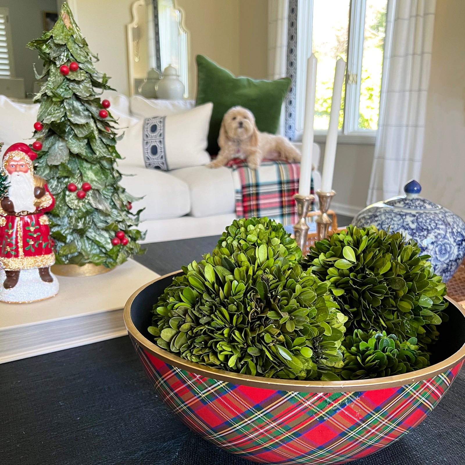 This season, we are THRILLED to bring you an exclusive piece from our collaboration with Jaye's Studio! Available only on our website, this gorgeous, large centerpiece bowl is a showstopper. It has a glossy tartan plaid on the outside, a crisp navy blue on the inside, and a hand-painted gold edge at the rim.