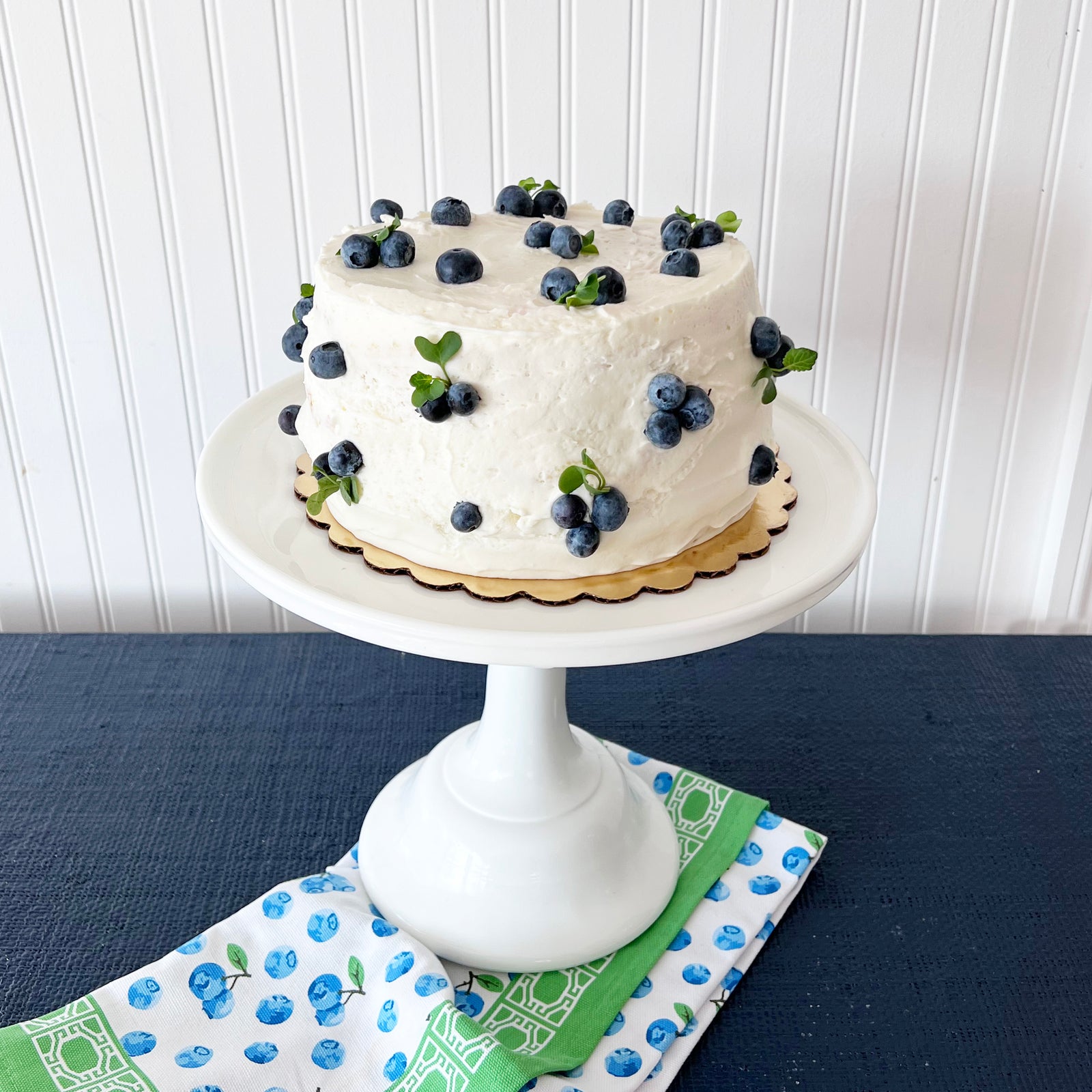 Our darling blueberries tea towel inspired Kelly to cook! Well, not really. She ordered a store-bought cake and then decorated it with blueberries and a touch of greenery.
