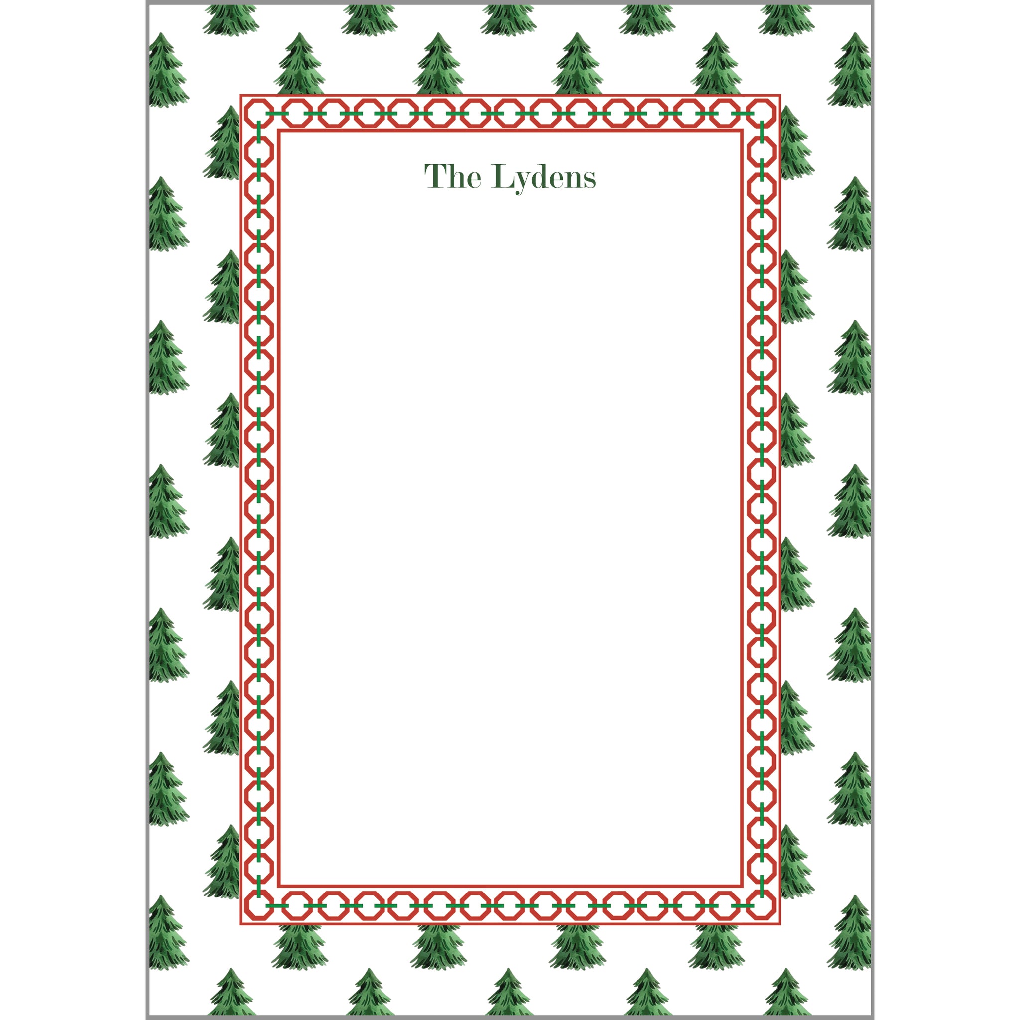 Perfectly preppy in every way. Meet our newest personalized notepad design: the Christmas Tree Farm! Write your notes in style with our personalized notepads. This darling new design features our Christmas tree farm pattern and red chain link border, along with your personalization at the top. It is available in the following sizes: