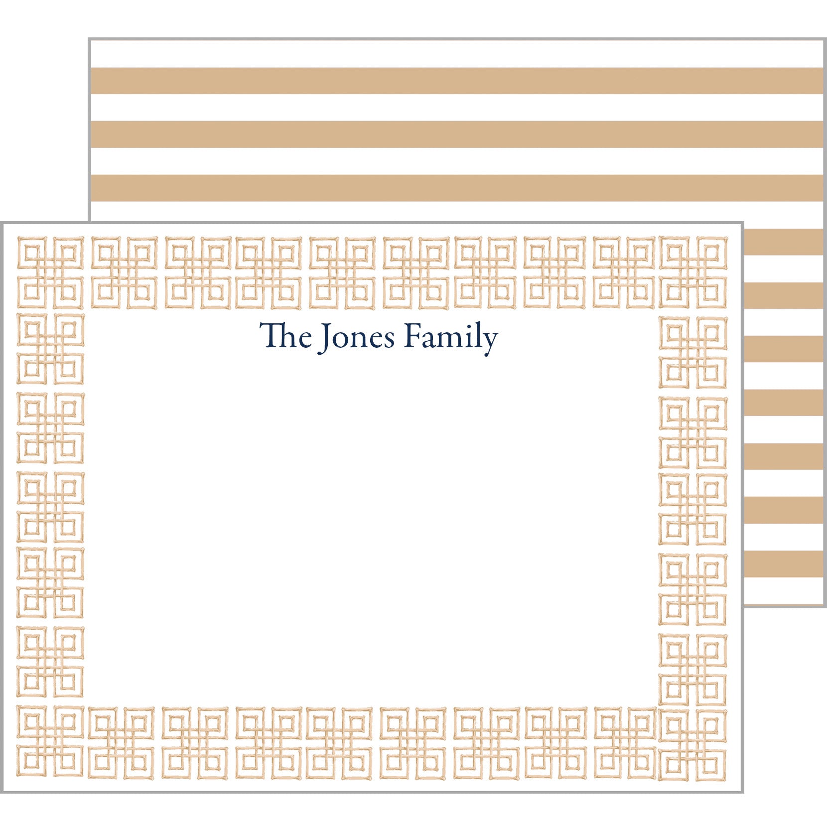Write your notes in style with our brand-new double-sided flat notecards! This darling piece of stationery features our charming bamboo fret border and your name on the front. The back features an all-over stripe pattern.