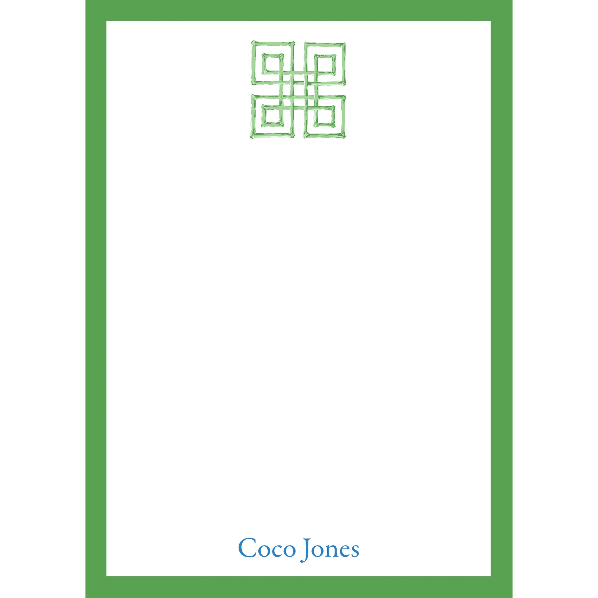 Perfectly preppy in every way. Meet our newest design: the bamboo fret square icon! Write your notes in style with our personalized notepads. This charming new notepad features a solid border and chic bamboo fret icon at the top, and it can be personalized with your name at the bottom. It is available in the following sizes: