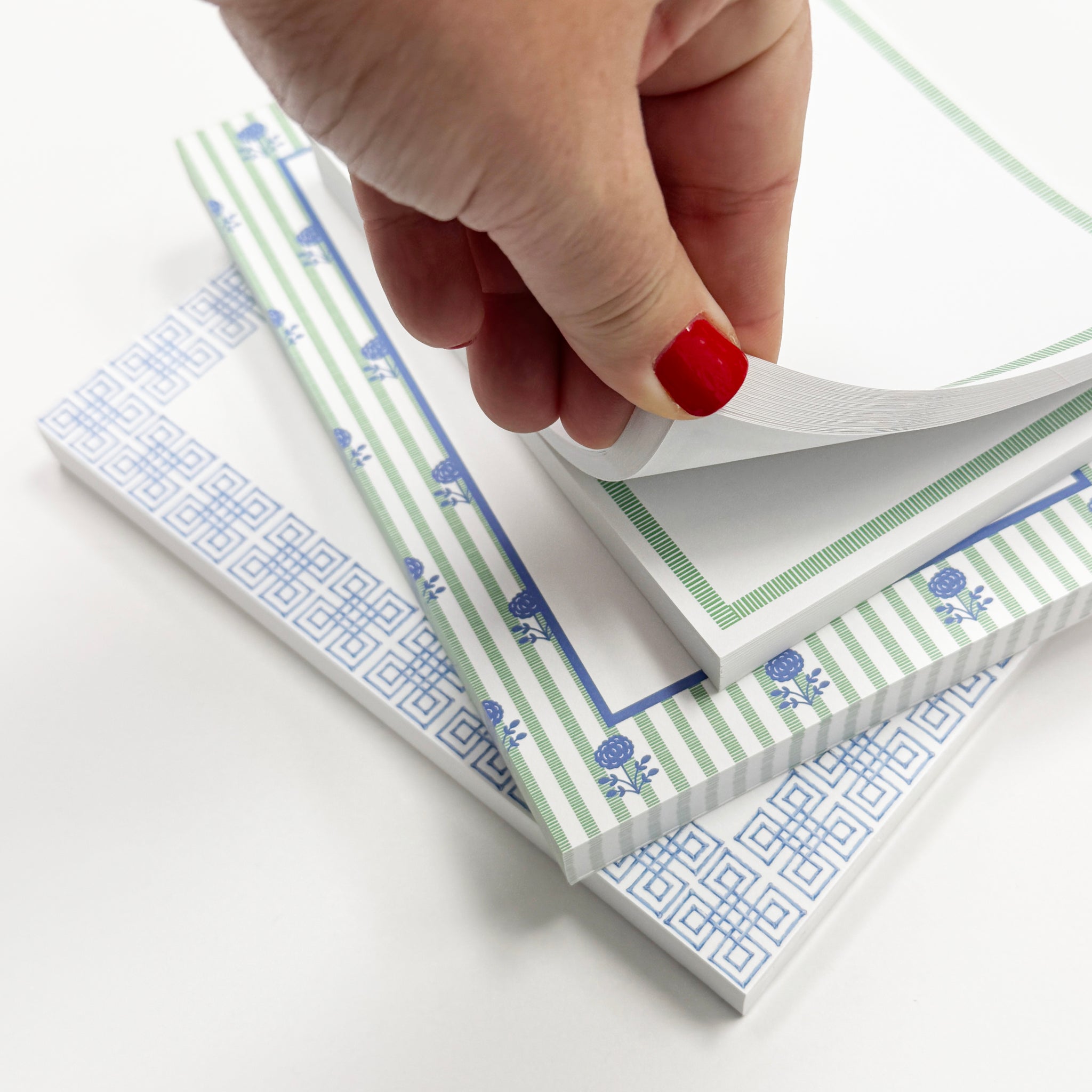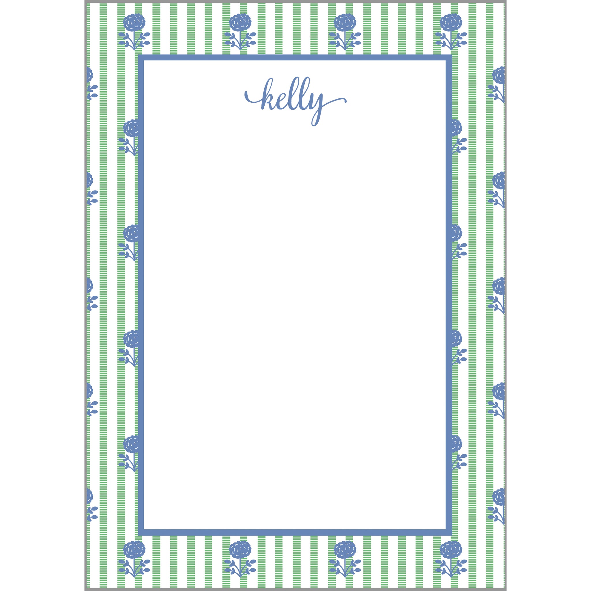 Perfectly preppy in every way. Meet our newest design: the floral stripe! Write your notes in style with our personalized notepads. This charming new notepad features a border of our floral stripe pattern in green and blue, and it can be personalized with your name at the top. It is available in the following sizes: