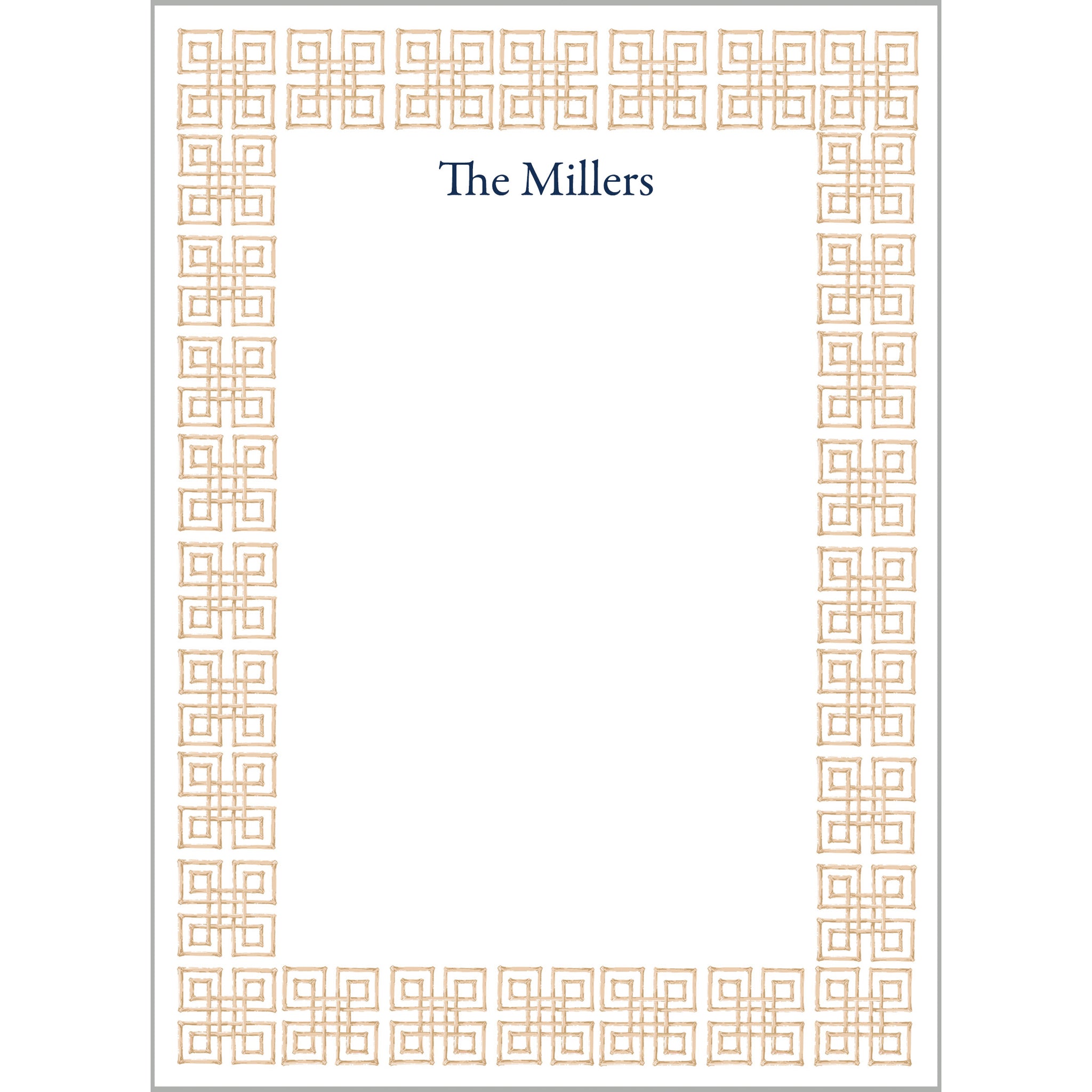 Perfectly preppy in every way. Meet our newest design: the bamboo fret! Write your notes in style with our personalized notepads. This charming new notepad features a border of our chic bamboo fret pattern, and it can be personalized with your name at the top. It is available in the following sizes: