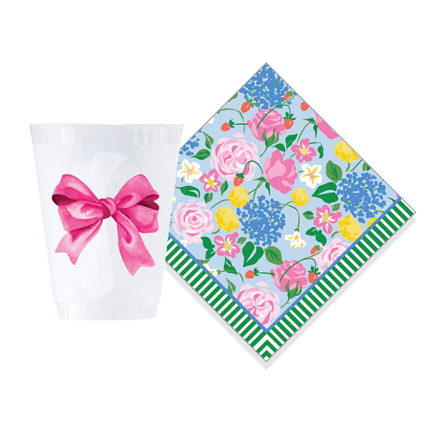Perfect for the entertainer or to give as a gift this Spring. This bundle includes a set of 8 pink bow shatterproof cups and a pack of 20 cocktail napkins in our strawberry floral pattern. It comes packaged together in a clear bag tied with a bow....ready for gifting!