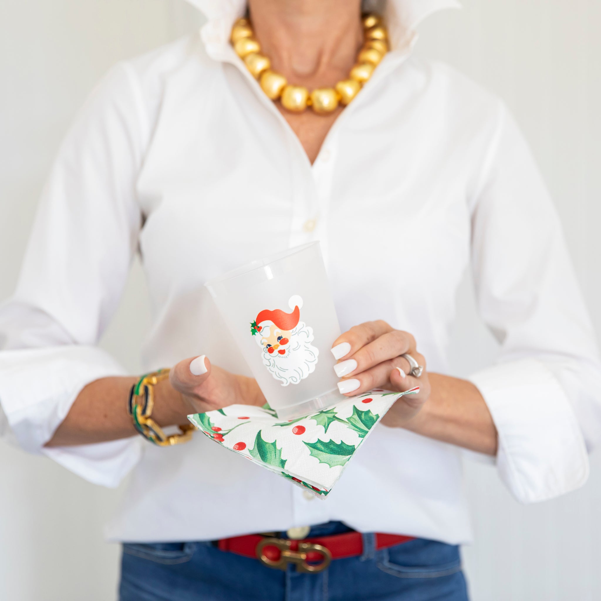 Perfect for the entertainer or to give as a gift this holiday season. This bundle includes a set of 8 Santa Claus shatterproof cups and a pack of 20 cocktail napkins in our holly pattern. Perfect for Christmas! It comes packaged together in a clear bag tied with a bow....ready for gifting!