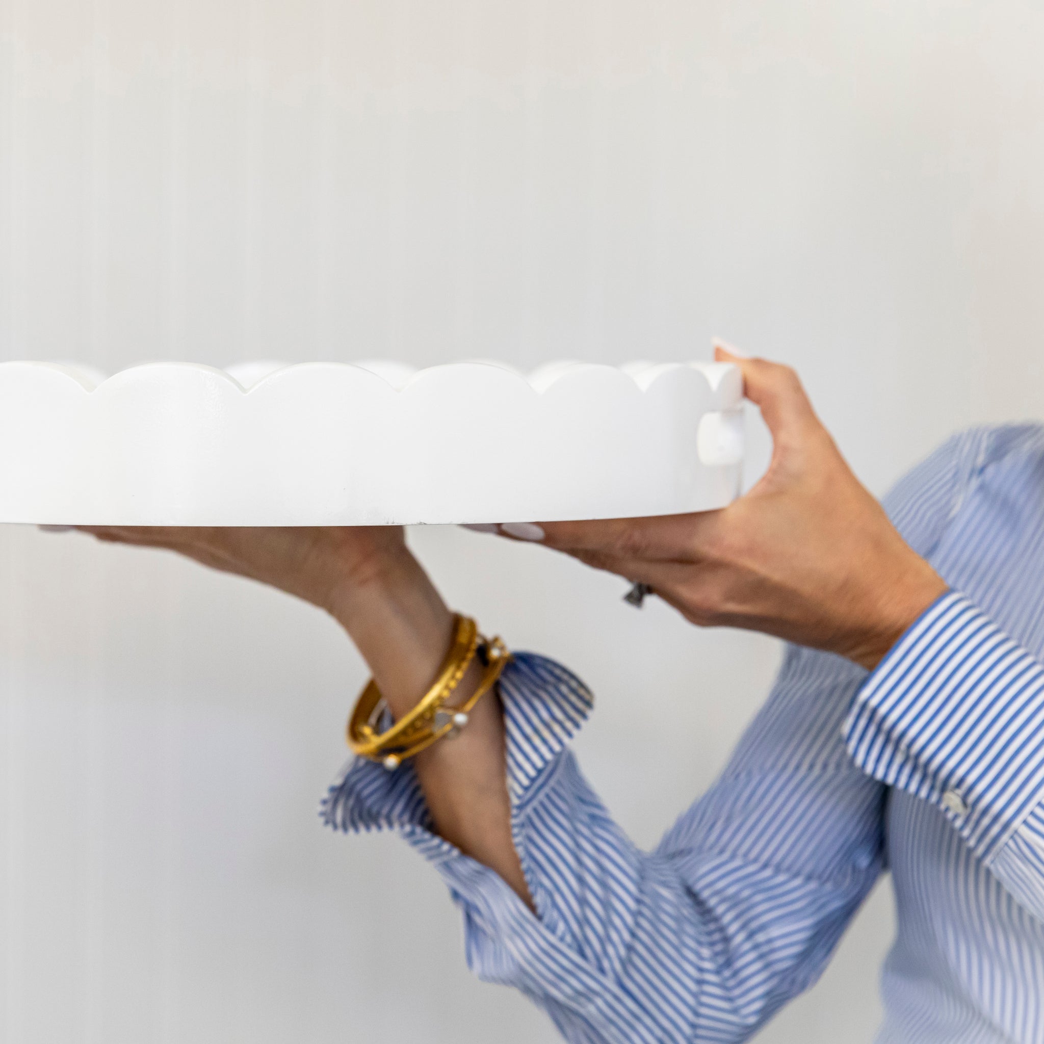 Lacquered white on the outside and enameled with our blue and white tulip block print pattern on the inside, making it a must-have piece for your home. The size is perfect for your coffee table, your bar set up, or for serving treats or breakfast in bed.