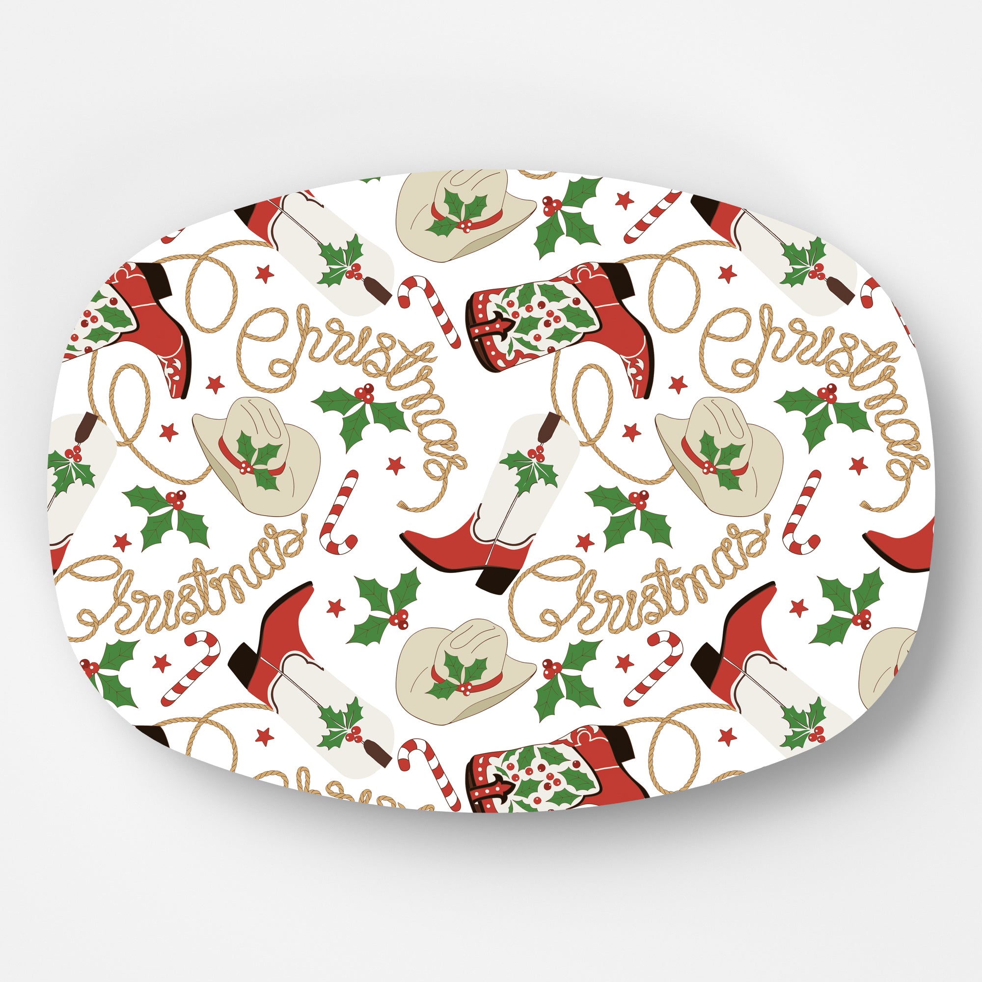 Our brand new platters make a great addition to our entertaining items. They look and feel like melamine, but are BETTER!! This Cowboy Christmas pattern is perfect for holiday entertaining.