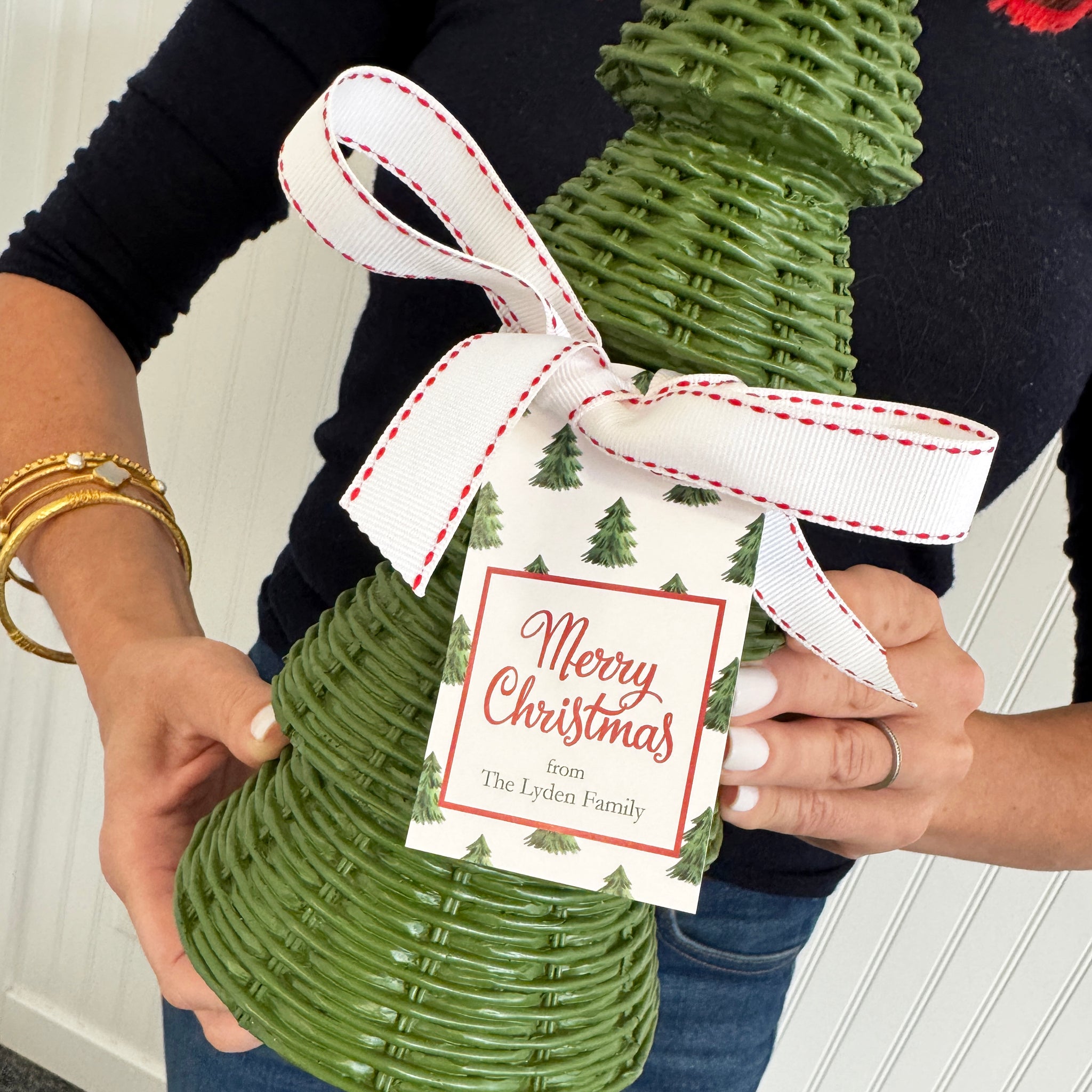 We're thrilled to introduce our brand new personalized Christmas gift tags. Full color, and fully customizable to suit your needs. This gift tag features our darling Christmas tree farm pattern and Merry Christmas greeting, and can be personalized with a name. It is blank on the back - perfect for writing a note!
