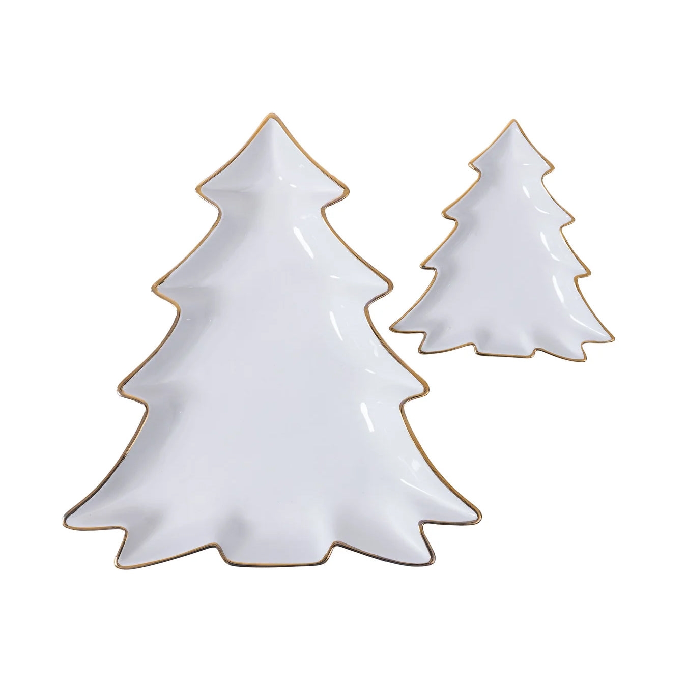Elevate your holiday entertaining with our Tree Platter Set, featuring two elegant white tree-shaped platters with a luxurious gold rim. Perfect for serving hors d'oeuvres, desserts, or festive treats, these platters bring a sophisticated touch to your holiday table. Their charming tree shape adds a festive flair, while the gold rim offers a timeless, refined finish.